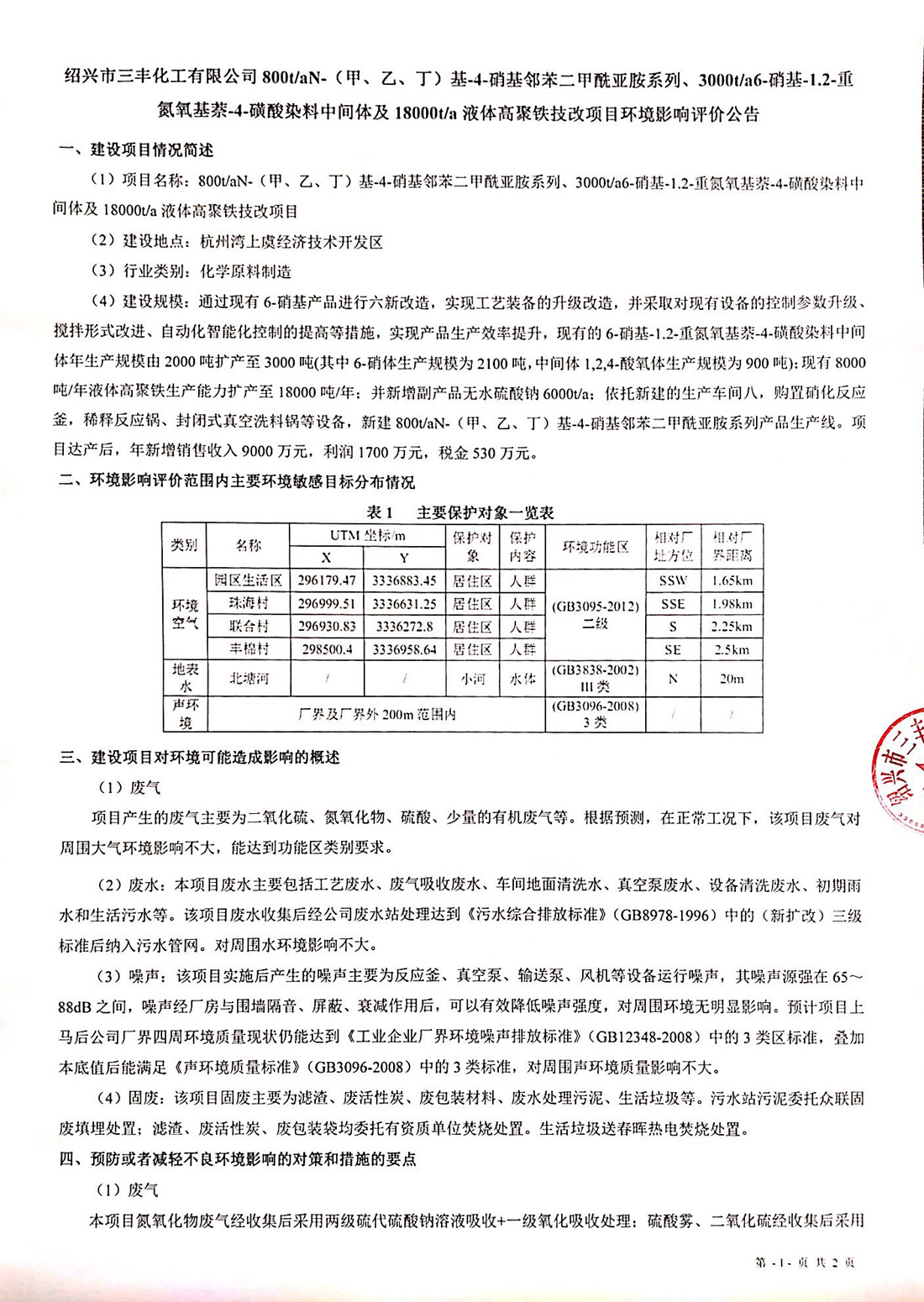 紹興市三豐化工有限公司800t/aN-(甲、乙、?。┗?4-硝基鄰苯二甲酰亞胺系列、3000t/a6-硝基-1.2-重氮氧基萘-4-磺酸染料中間體及18000t/a液體高聚鐵技改項目環(huán)境影響評價公告